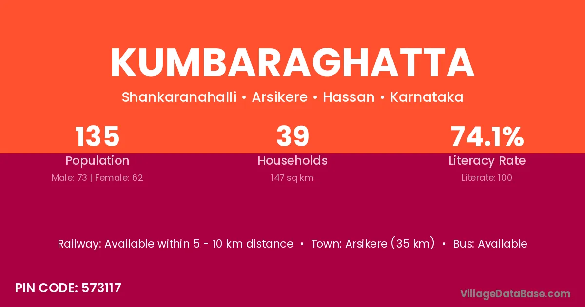Kumbaraghatta village has a total population of 135 people, of which 73 are males and 62 are females.