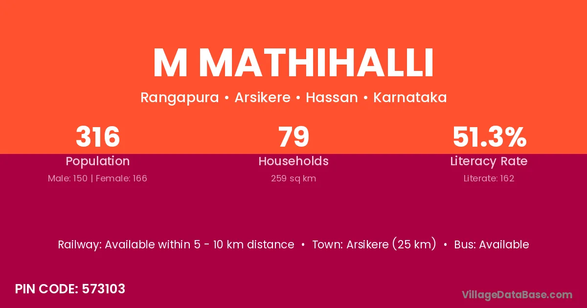 Arsikere (25 km) is the nearest town to M Mathihalli village for major economic activities and is located approximately 25 km away.