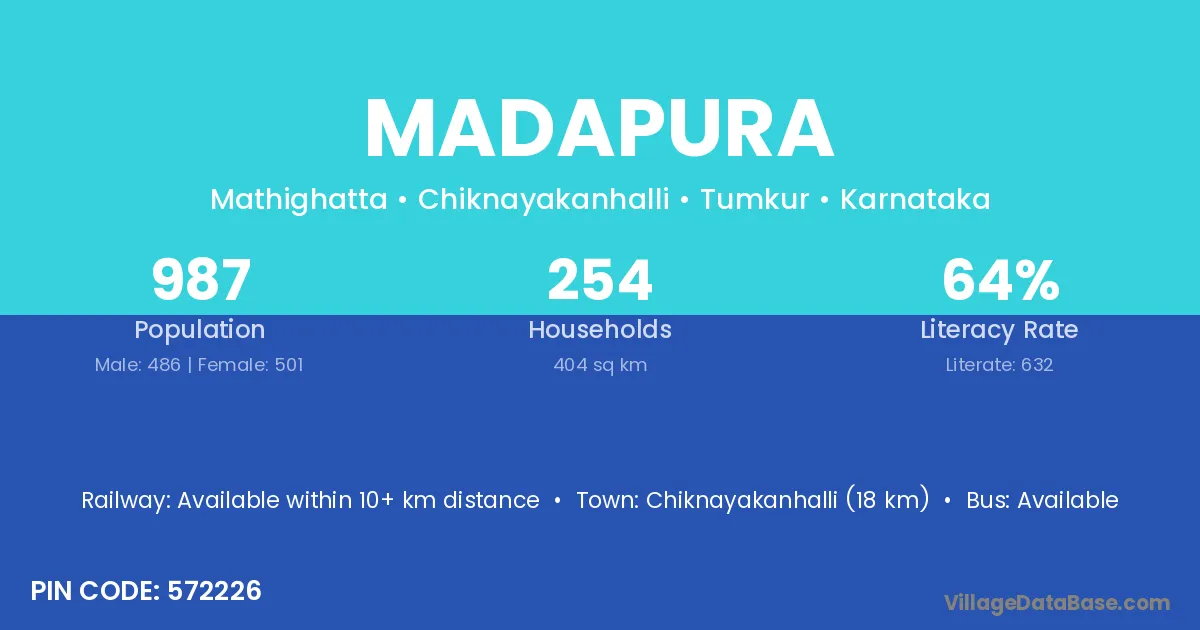Arsikere (20 km) is the nearest town to Madapura village for major economic activities and is located approximately 20 km away.