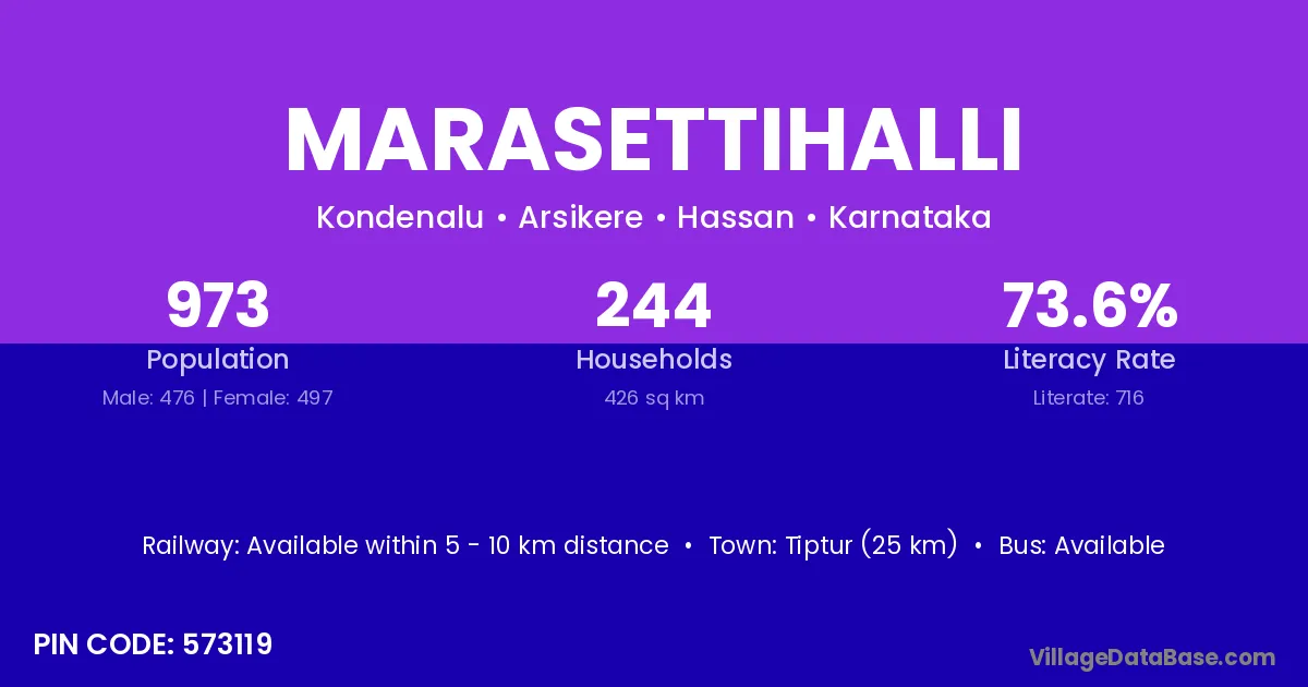 Tiptur (25 km) is the nearest town to Marasettihalli village for major economic activities and is located approximately 25 km away.