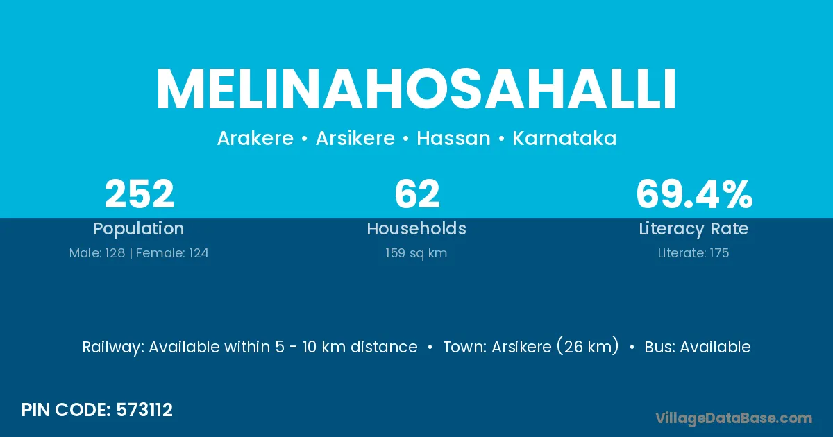 Arsikere (26 km) is the nearest town to Melinahosahalli village for major economic activities and is located approximately 26 km away.