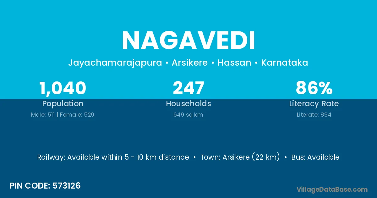 Arsikere (22 km) is the nearest town to Nagavedi village for major economic activities and is located approximately 22 km away.