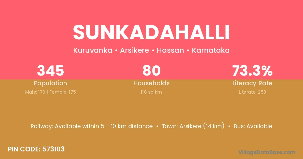 Sunkadahalli village has a total population of 345 people, of which 170 are males and 175 are females.