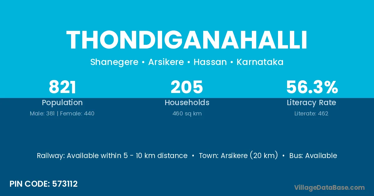 Arsikere (20 km) is the nearest town to Thondiganahalli village for major economic activities and is located approximately 20 km away.