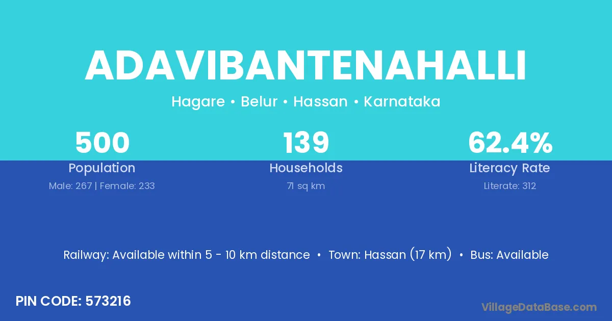 Hassan (17 km) is the nearest town to Adavibantenahalli village for major economic activities and is located approximately 17 km away.