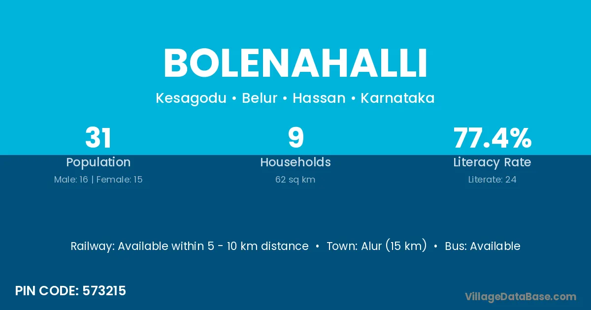 Bolenahalli village has a total population of 31 people, of which 16 are males and 15 are females.