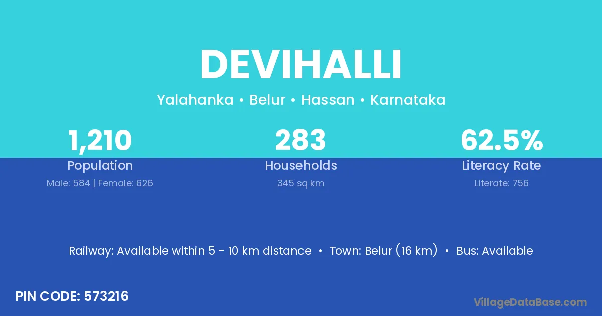 Belur (16 km) is the nearest town to Devihalli village for major economic activities and is located approximately 16 km away.