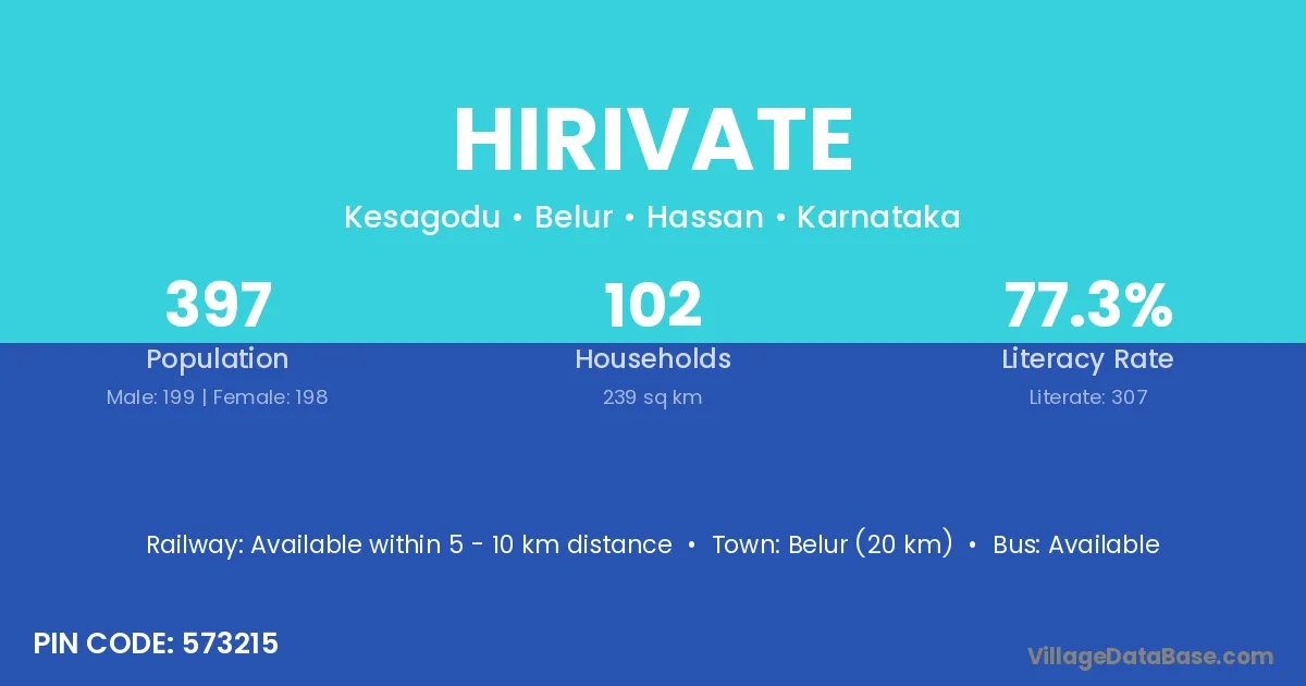 Belur (20 km) is the nearest town to Hirivate village for major economic activities and is located approximately 20 km away.