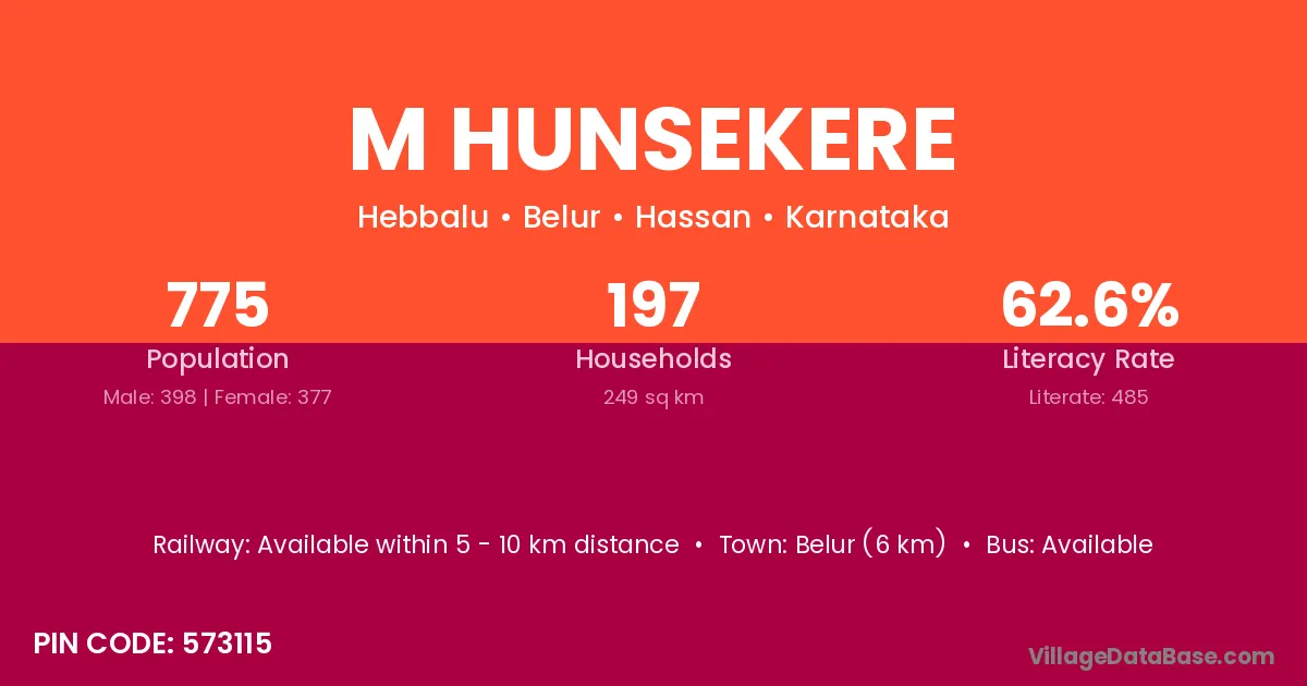 Belur (6 km) is the nearest town to M Hunsekere village for major economic activities and is located approximately 6 km away.