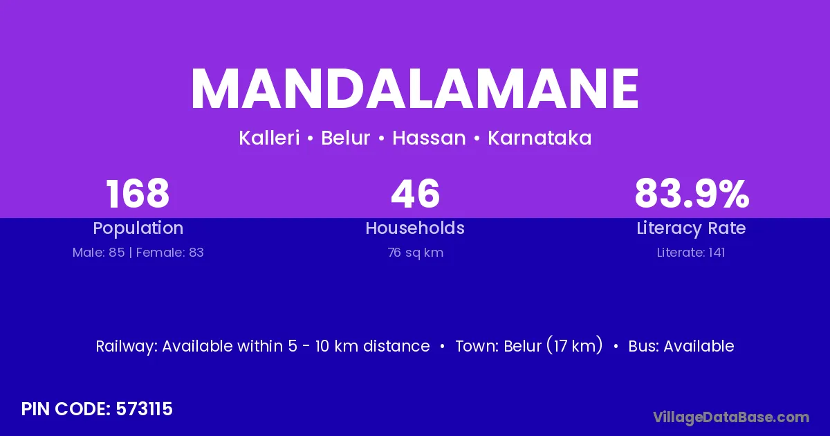 Belur (17 km) is the nearest town to Mandalamane village for major economic activities and is located approximately 17 km away.