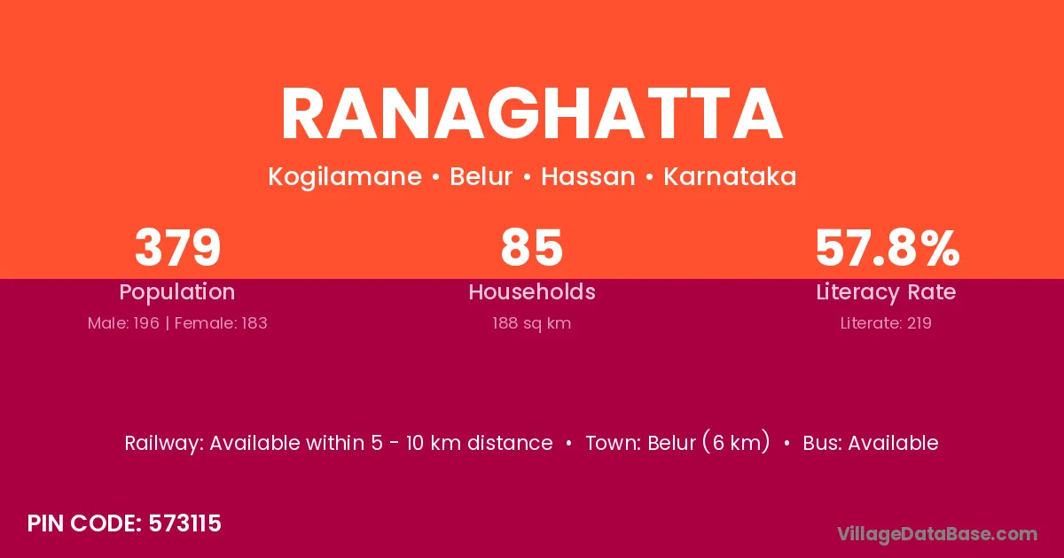 Ranaghatta village has a total population of 379 people, of which 196 are males and 183 are females.