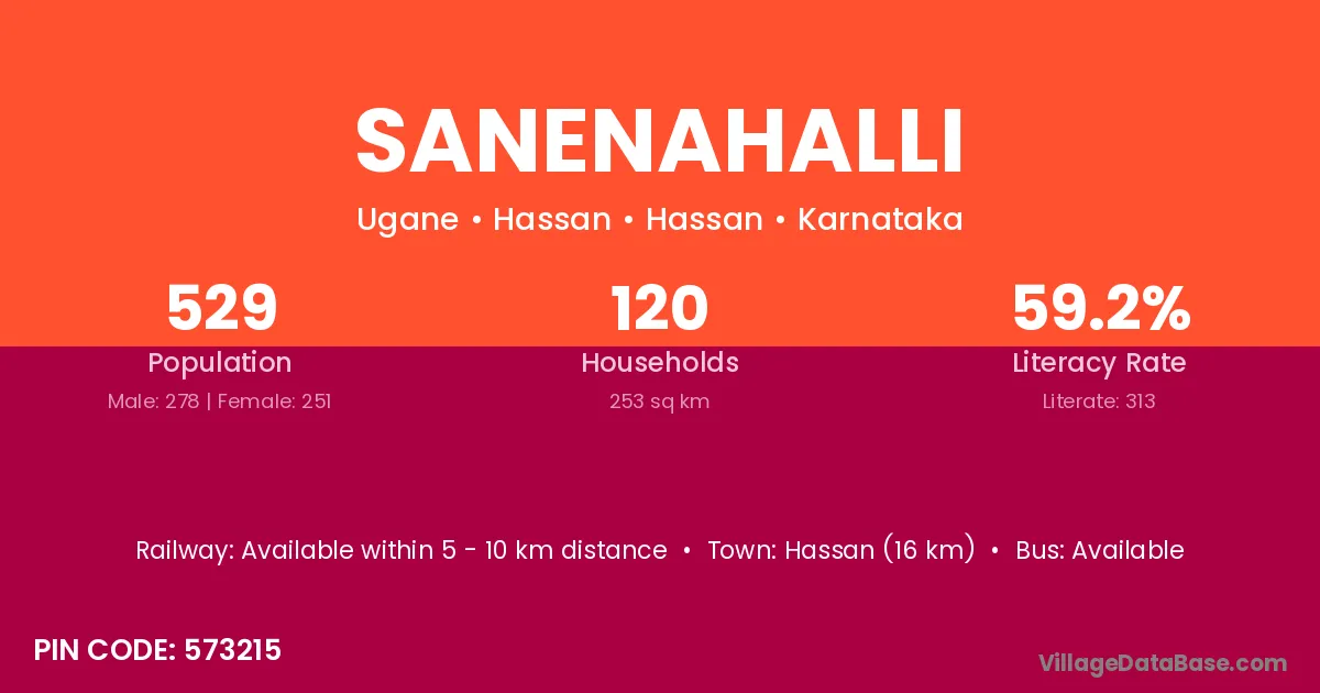 The literacy rate of Sanenahalli village is 65.57%. Male literacy stands at 73.72% and female literacy at 57.35%.