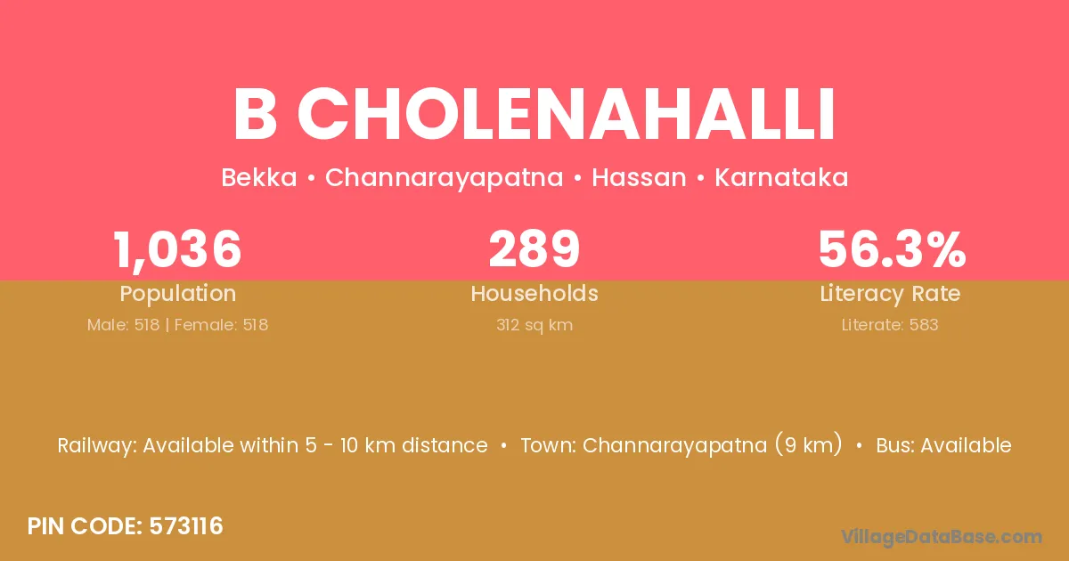B Cholenahalli village has a total population of 1,036 people, of which 518 are males and 518 are females.