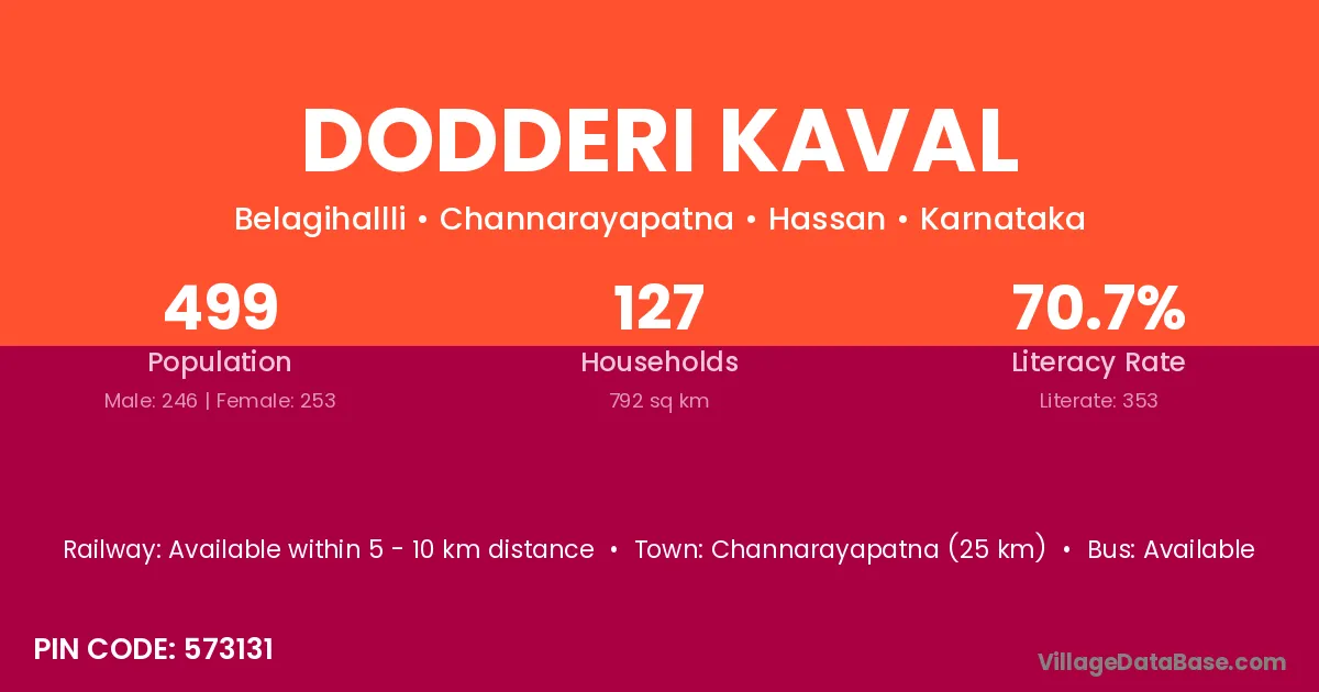 Channarayapatna (25 km) is the nearest town to Dodderi Kaval village for major economic activities and is located approximately 25 km away.