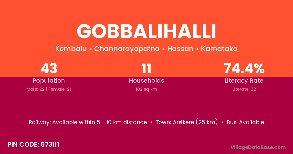 Gobbalihalli village has a total population of 43 people, of which 22 are males and 21 are females.