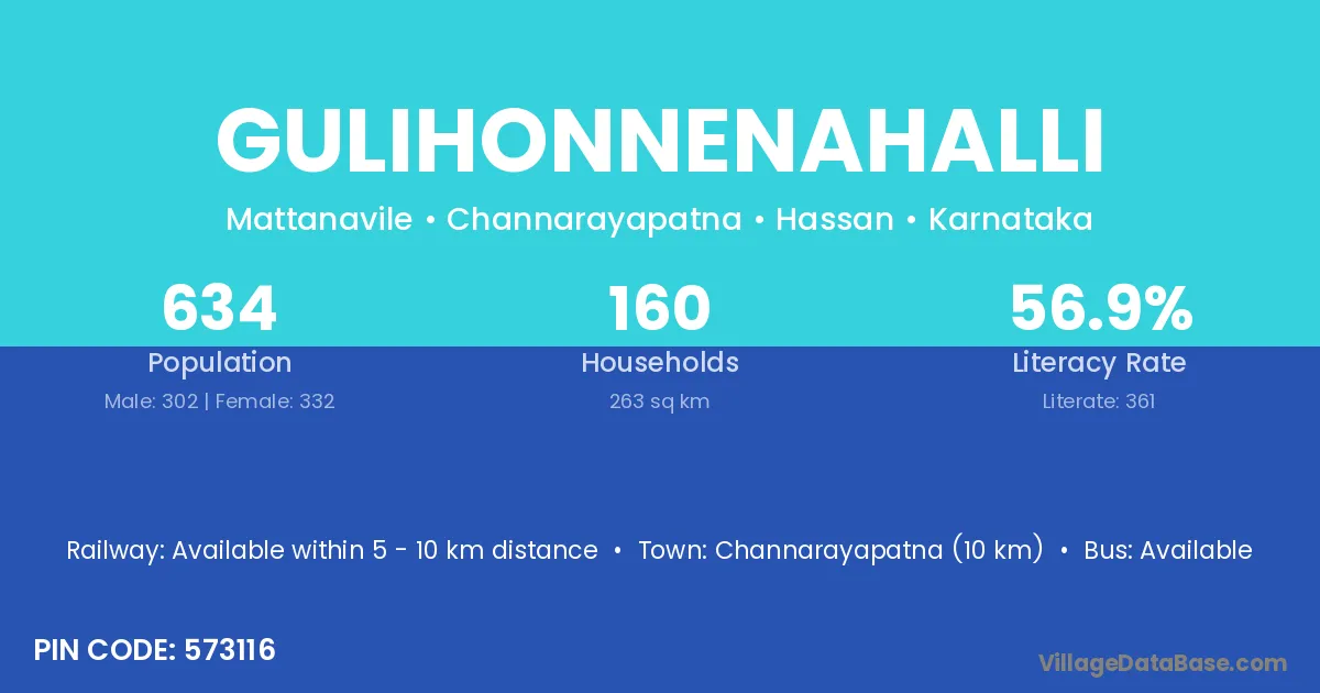 Gulihonnenahalli village has a total population of 634 people, of which 302 are males and 332 are females.