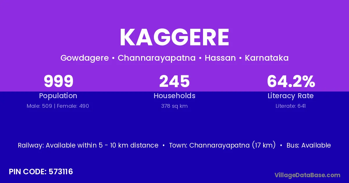Channarayapatna (17 km) is the nearest town to Kaggere village for major economic activities and is located approximately 17 km away.
