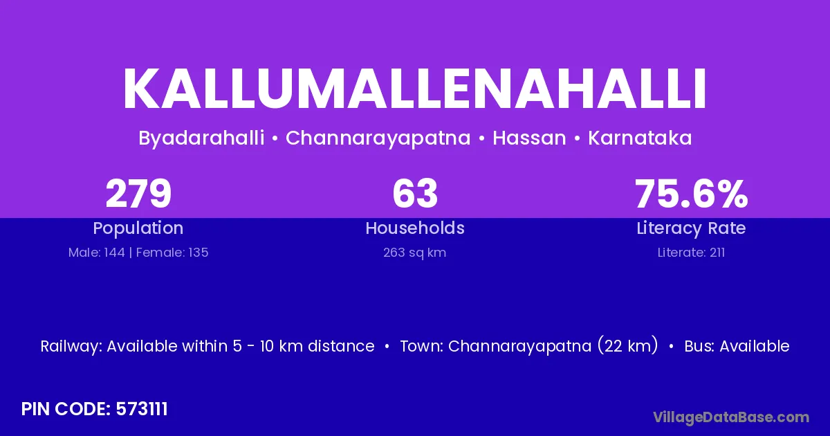 Channarayapatna (22 km) is the nearest town to Kallumallenahalli village for major economic activities and is located approximately 22 km away.