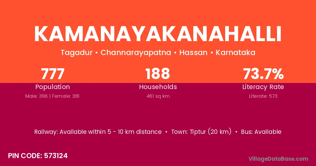 Tiptur (20 km) is the nearest town to Kamanayakanahalli village for major economic activities and is located approximately 20 km away.