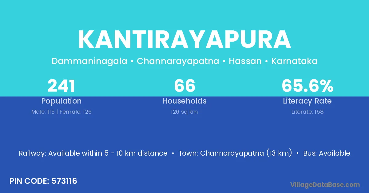 Channarayapatna (13 km) is the nearest town to Kantirayapura village for major economic activities and is located approximately 13 km away.