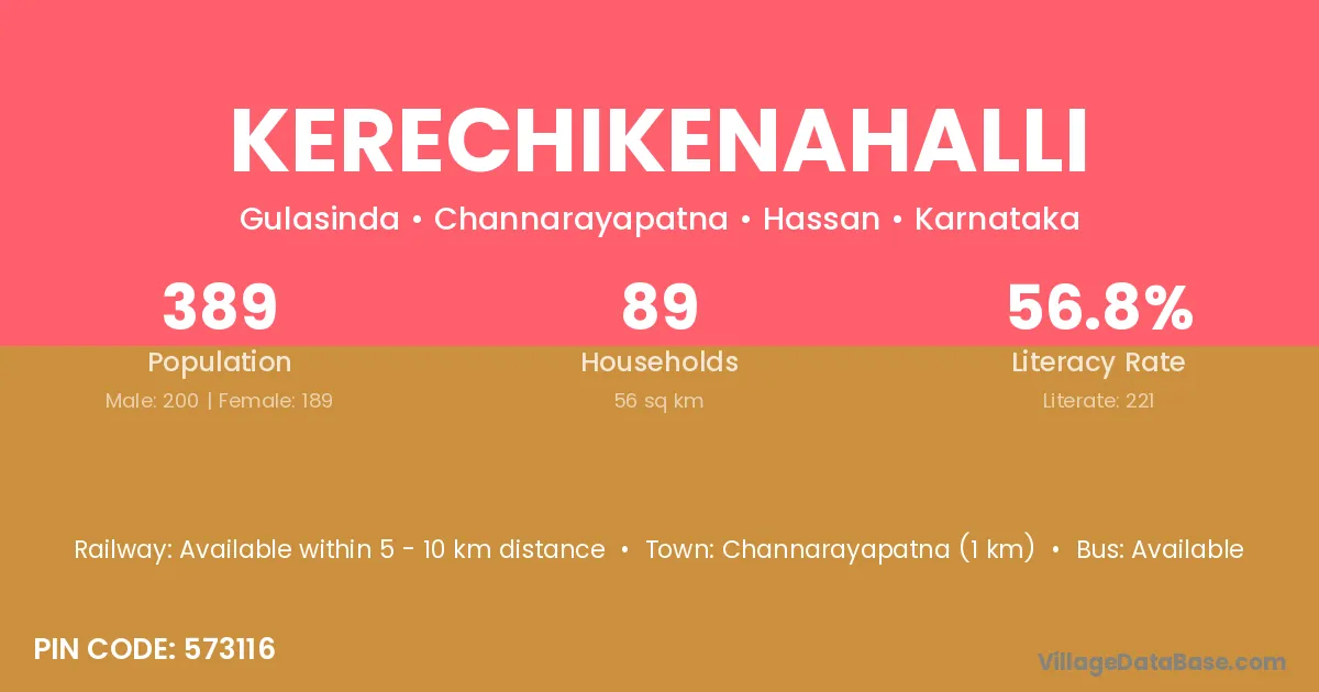 Channarayapatna (1 km) is the nearest town to Kerechikenahalli village for major economic activities and is located approximately 1 km away.
