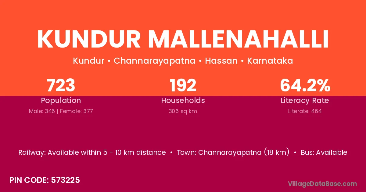 Channarayapatna (18 km) is the nearest town to Kundur Mallenahalli village for major economic activities and is located approximately 18 km away.