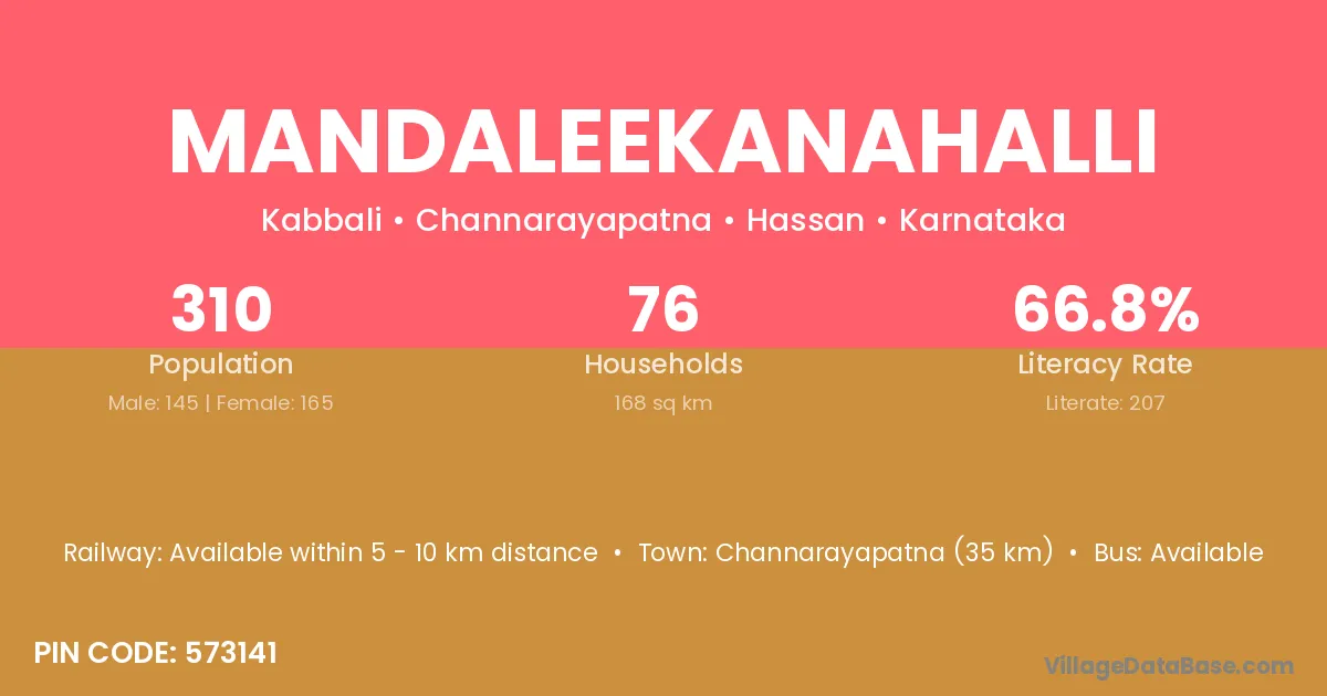 Mandaleekanahalli village has a total population of 310 people, of which 145 are males and 165 are females.