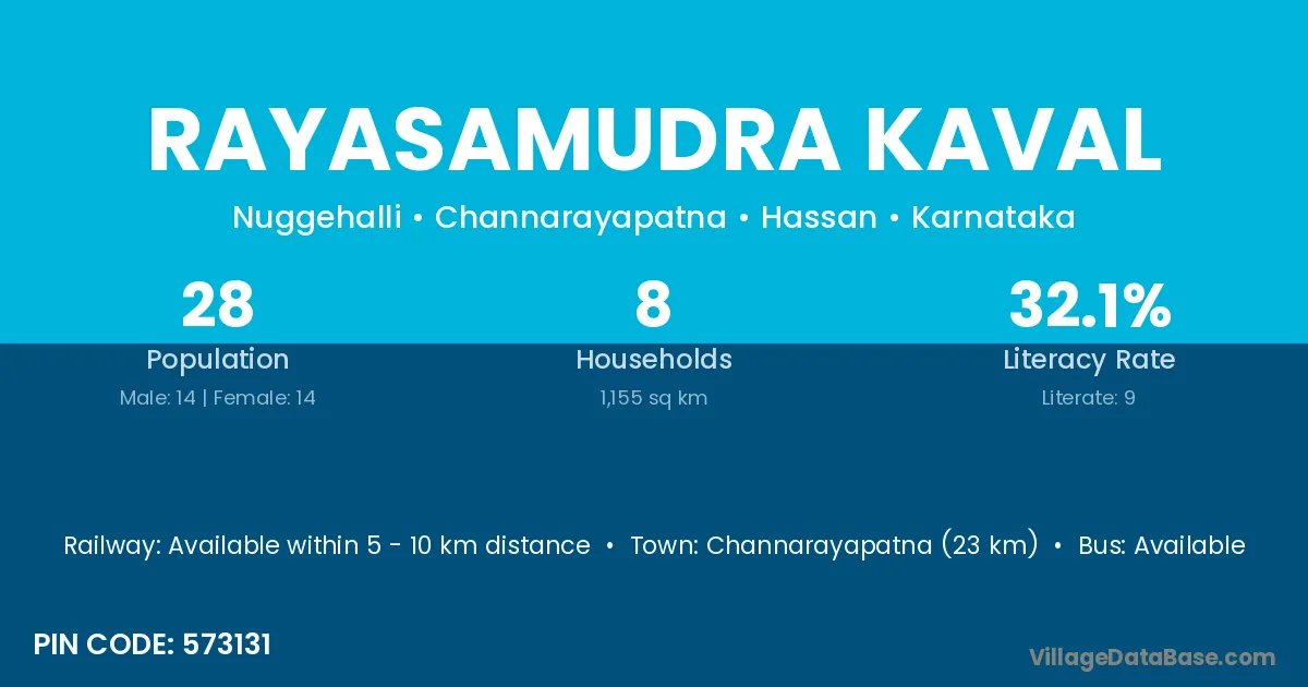 Channarayapatna (23 km) is the nearest town to Rayasamudra Kaval village for major economic activities and is located approximately 23 km away.