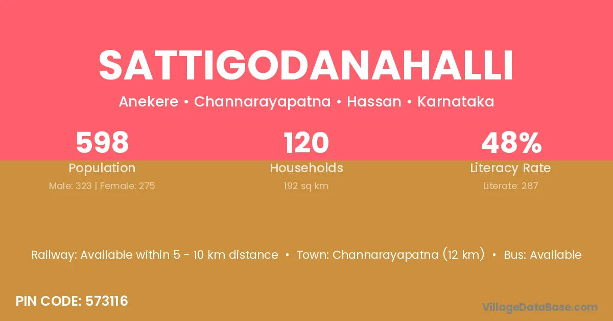 Sattigodanahalli village has a total population of 598 people, of which 323 are males and 275 are females.