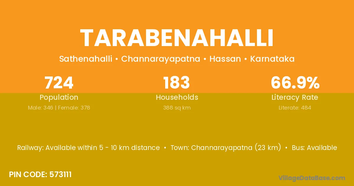 Tarabenahalli village has a total population of 724 people, of which 346 are males and 378 are females.