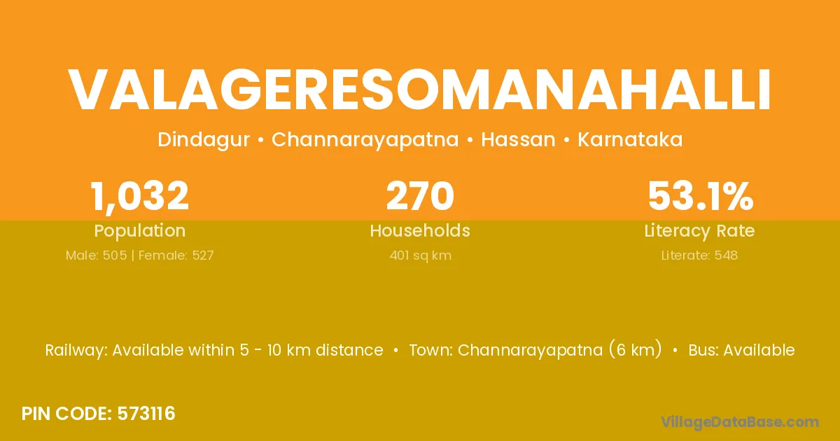 Valageresomanahalli village has a total population of 1,032 people, of which 505 are males and 527 are females.