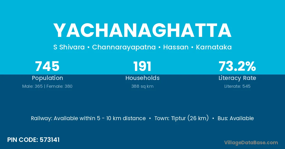 Tiptur (26 km) is the nearest town to Yachanaghatta village for major economic activities and is located approximately 26 km away.