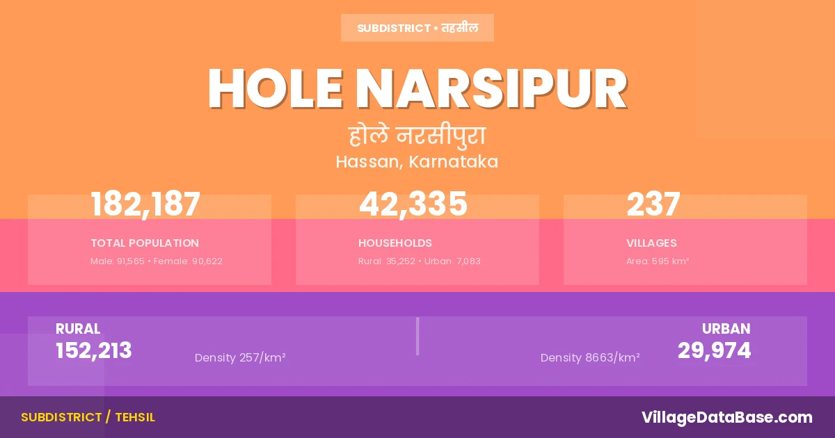 According to the 2011 census The total area of Hole Narsipur Taluka is 595 km², with a population of 182187 people. The population density is 306 inhabitants per square kilometre, and there are approximately 42335 houses in the sub district.