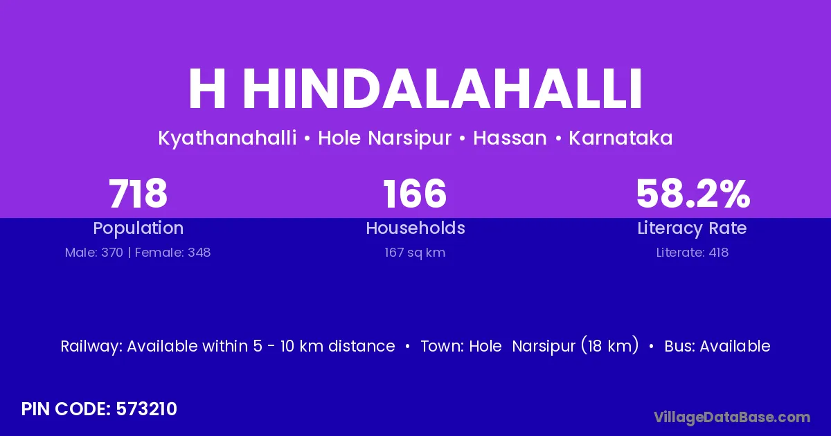Hole Narsipur (18 km) is the nearest town to H Hindalahalli village for major economic activities and is located approximately 18 km away.