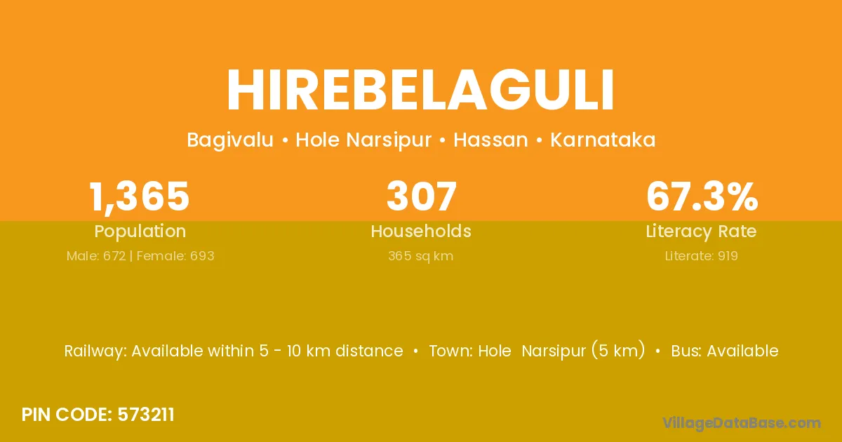 Hole Narsipur (5 km) is the nearest town to Hirebelaguli village for major economic activities and is located approximately 5 km away.