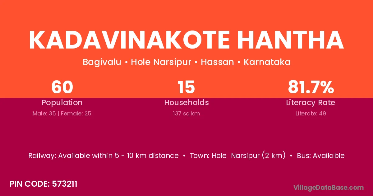 Hole Narsipur (2 km) is the nearest town to Kadavinakote Hantha village for major economic activities and is located approximately 2 km away.