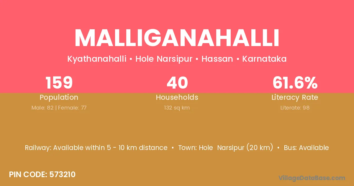 Malliganahalli village has a total population of 159 people, of which 82 are males and 77 are females.