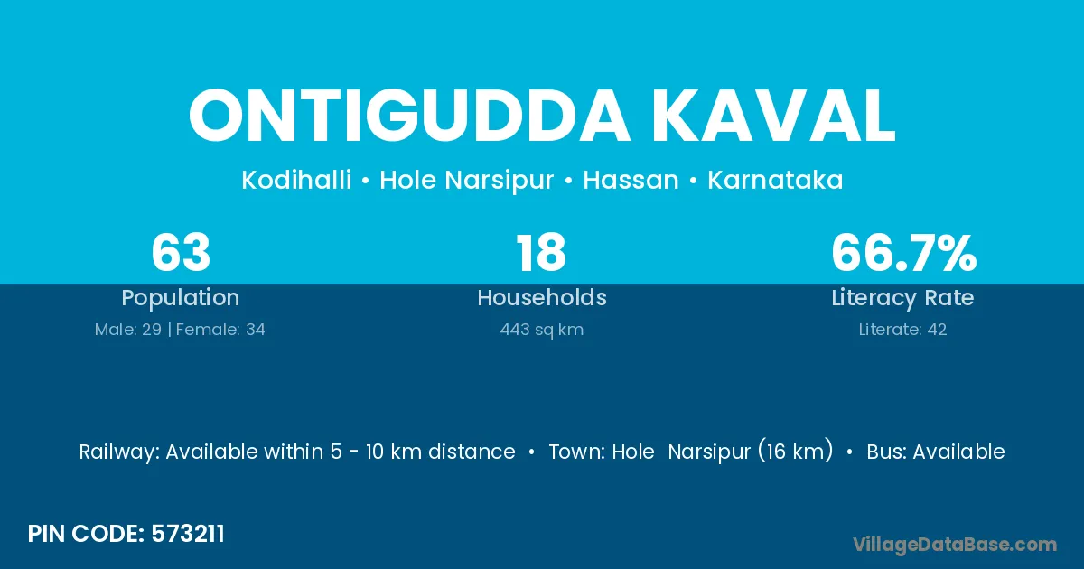 Ontigudda Kaval village has a total population of 63 people, of which 29 are males and 34 are females.