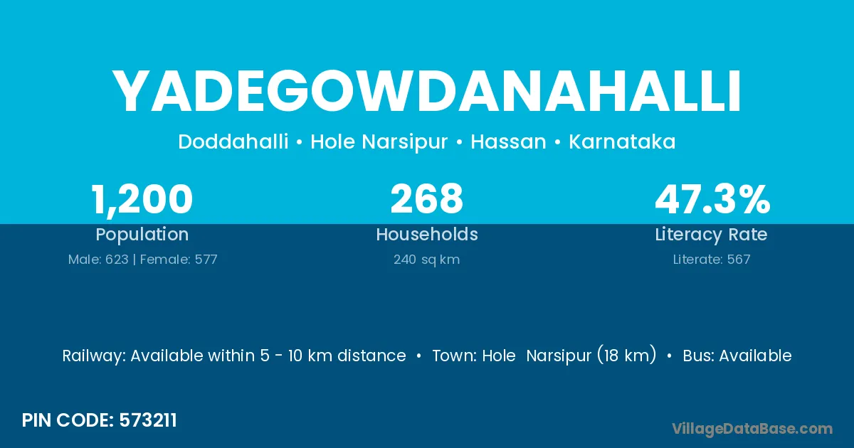 Hole Narsipur (18 km) is the nearest town to Yadegowdanahalli village for major economic activities and is located approximately 18 km away.