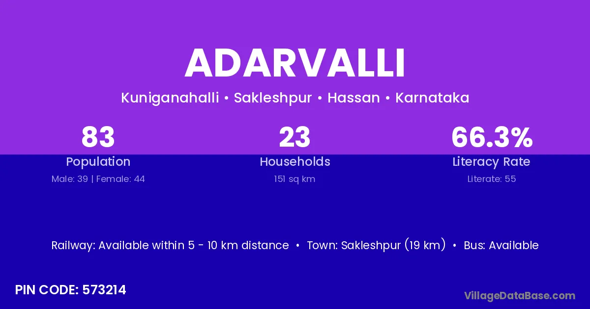 Sakleshpur (19 km) is the nearest town to Adarvalli village for major economic activities and is located approximately 19 km away.