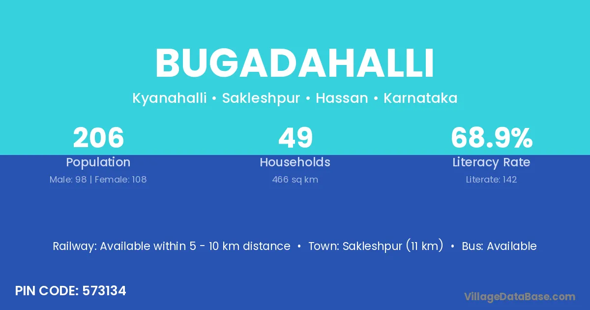 Bugadahalli village has a total population of 206 people, of which 98 are males and 108 are females.
