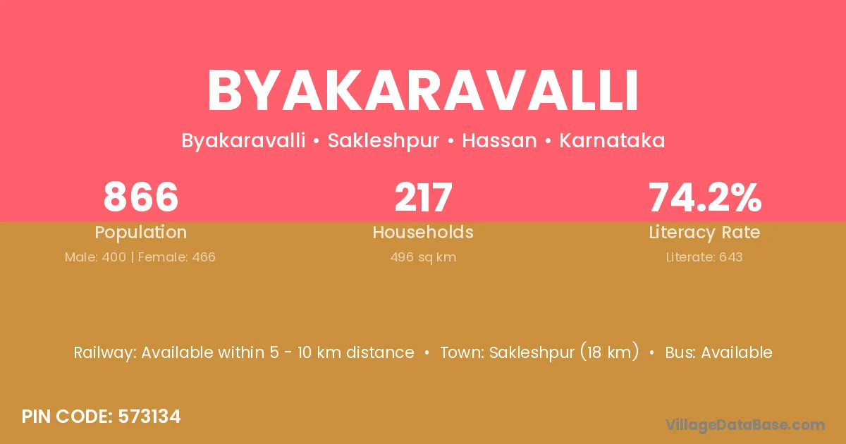 Sakleshpur (18 km) is the nearest town to Byakaravalli village for major economic activities and is located approximately 18 km away.