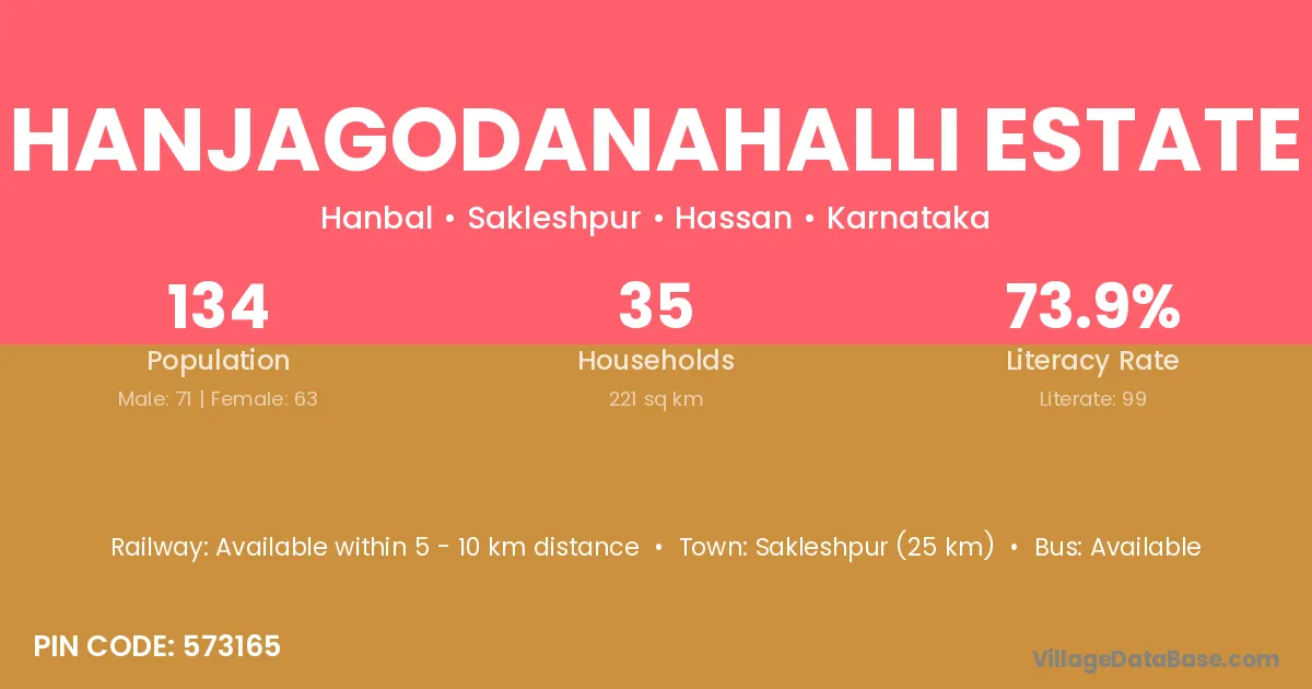 Hanjagodanahalli Estate village has a total population of 134 people, of which 71 are males and 63 are females.