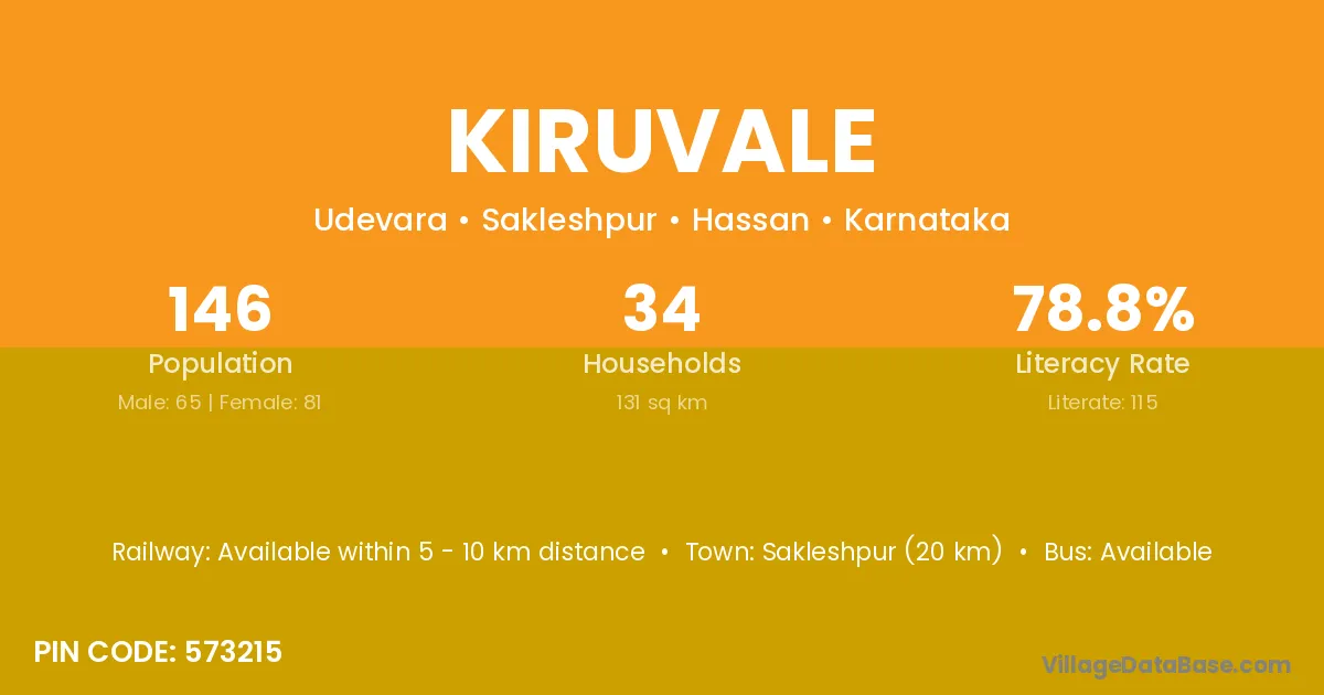 Sakleshpur (20 km) is the nearest town to Kiruvale village for major economic activities and is located approximately 20 km away.