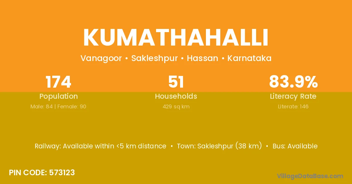 Sakleshpur (38 km) is the nearest town to Kumathahalli village for major economic activities and is located approximately 38 km away.