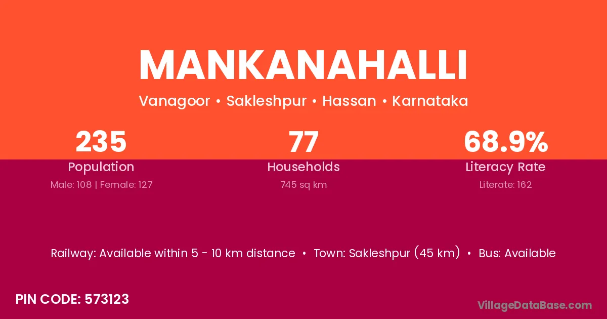 Sakleshpur (45 km) is the nearest town to Mankanahalli village for major economic activities and is located approximately 45 km away.