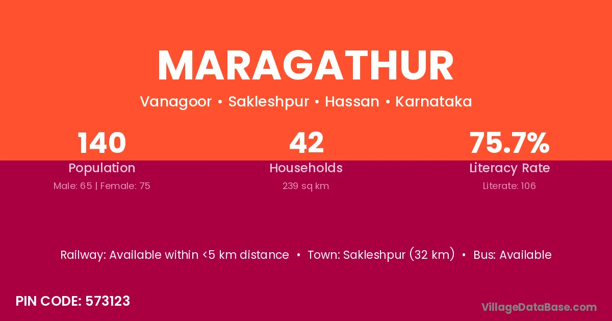 Sakleshpur (32 km) is the nearest town to Maragathur village for major economic activities and is located approximately 32 km away.