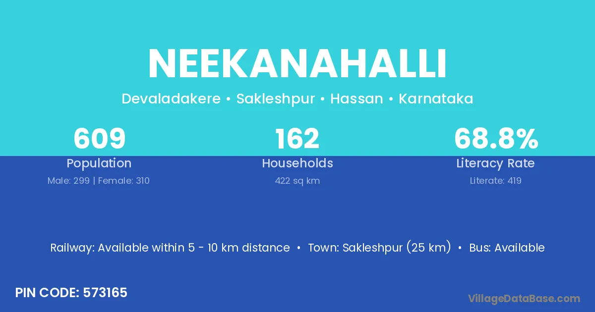 Sakleshpur (25 km) is the nearest town to Neekanahalli village for major economic activities and is located approximately 25 km away.