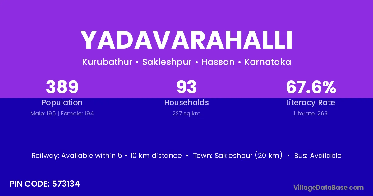 Sakleshpur (20 km) is the nearest town to Yadavarahalli village for major economic activities and is located approximately 20 km away.