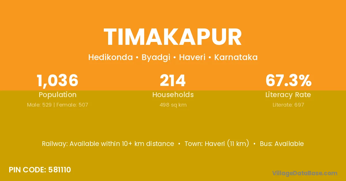 Haveri (11 km) is the nearest town to Timakapur village for major economic activities and is located approximately 11 km away.
